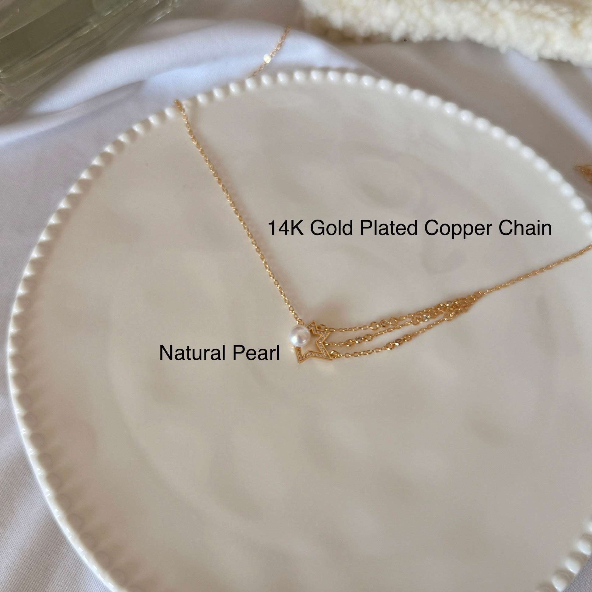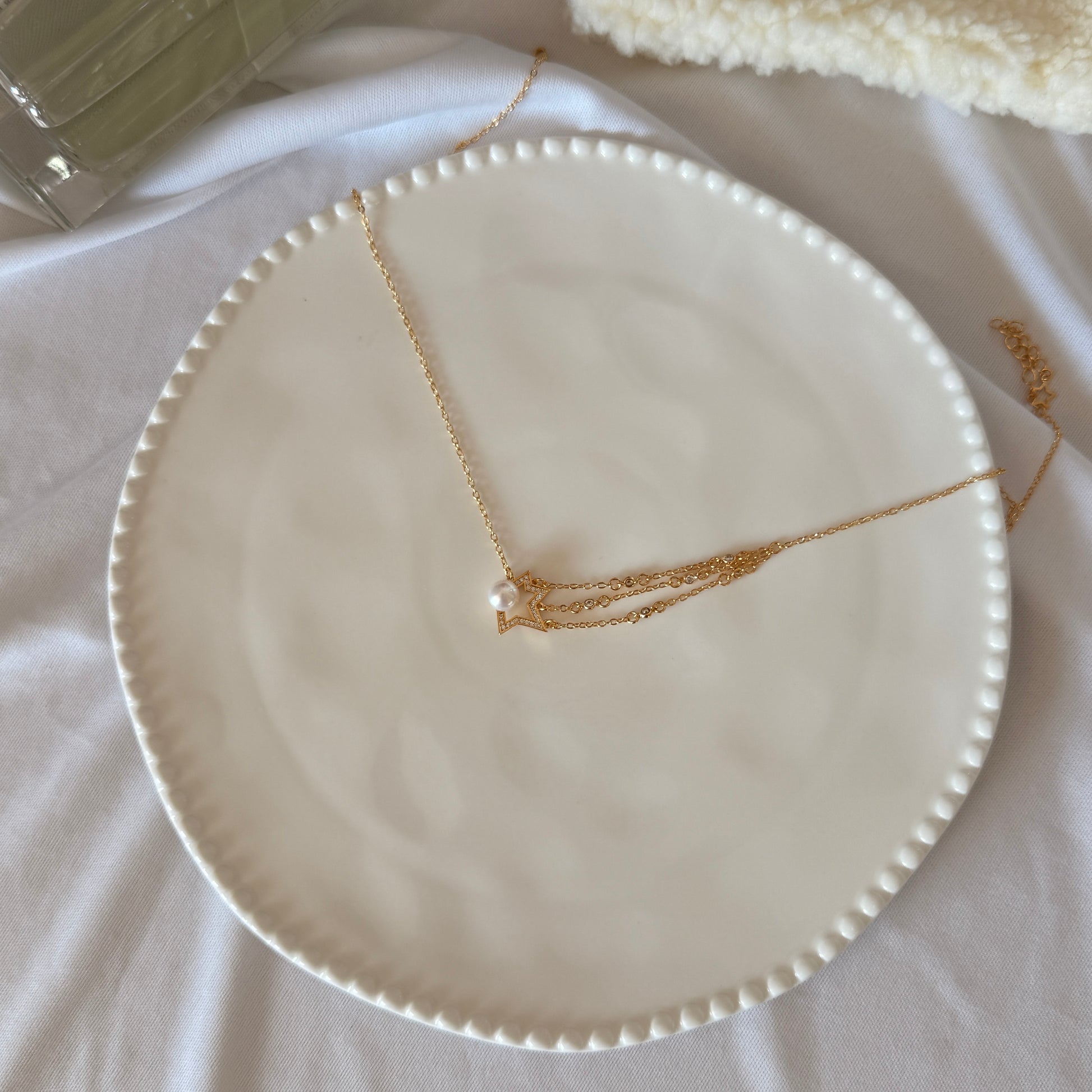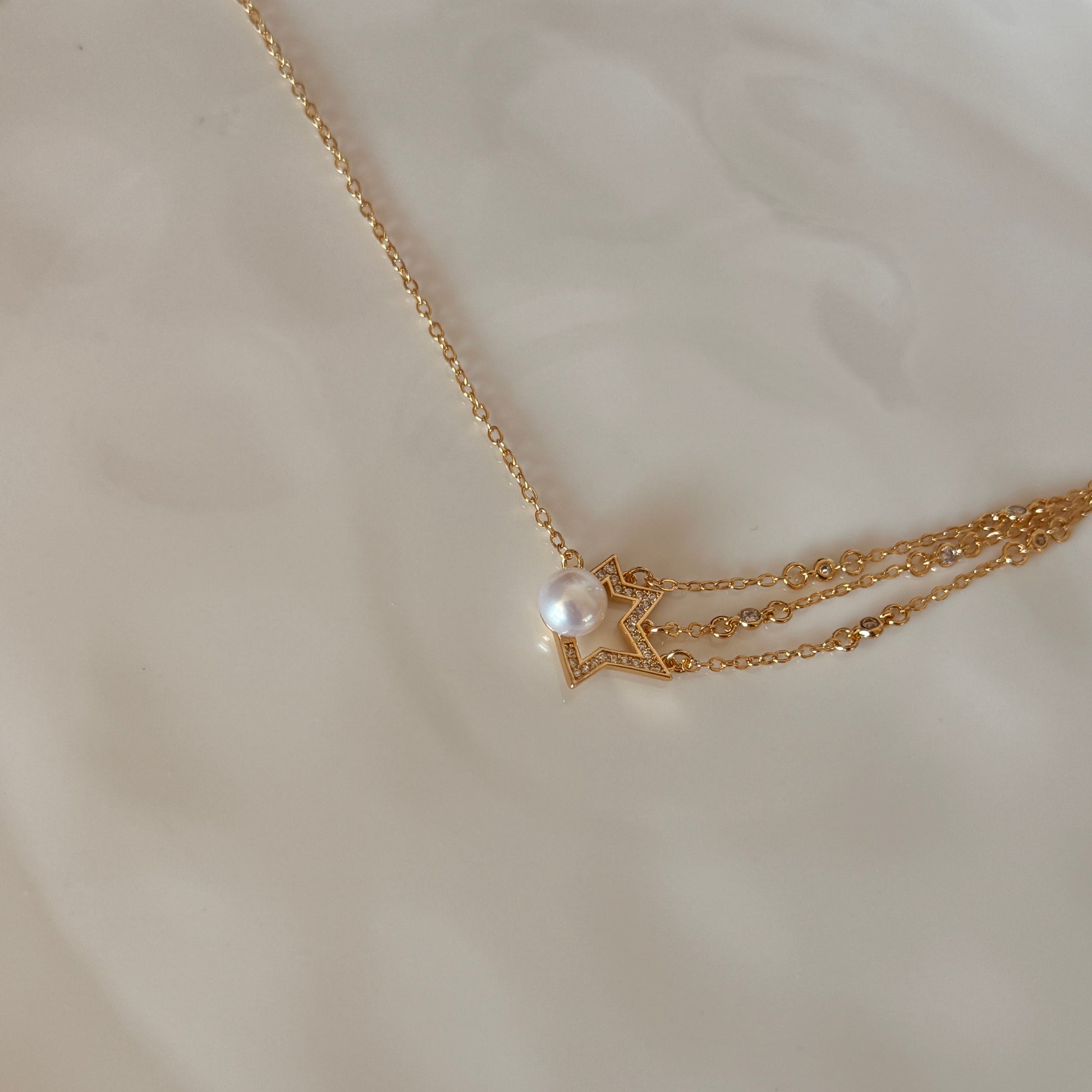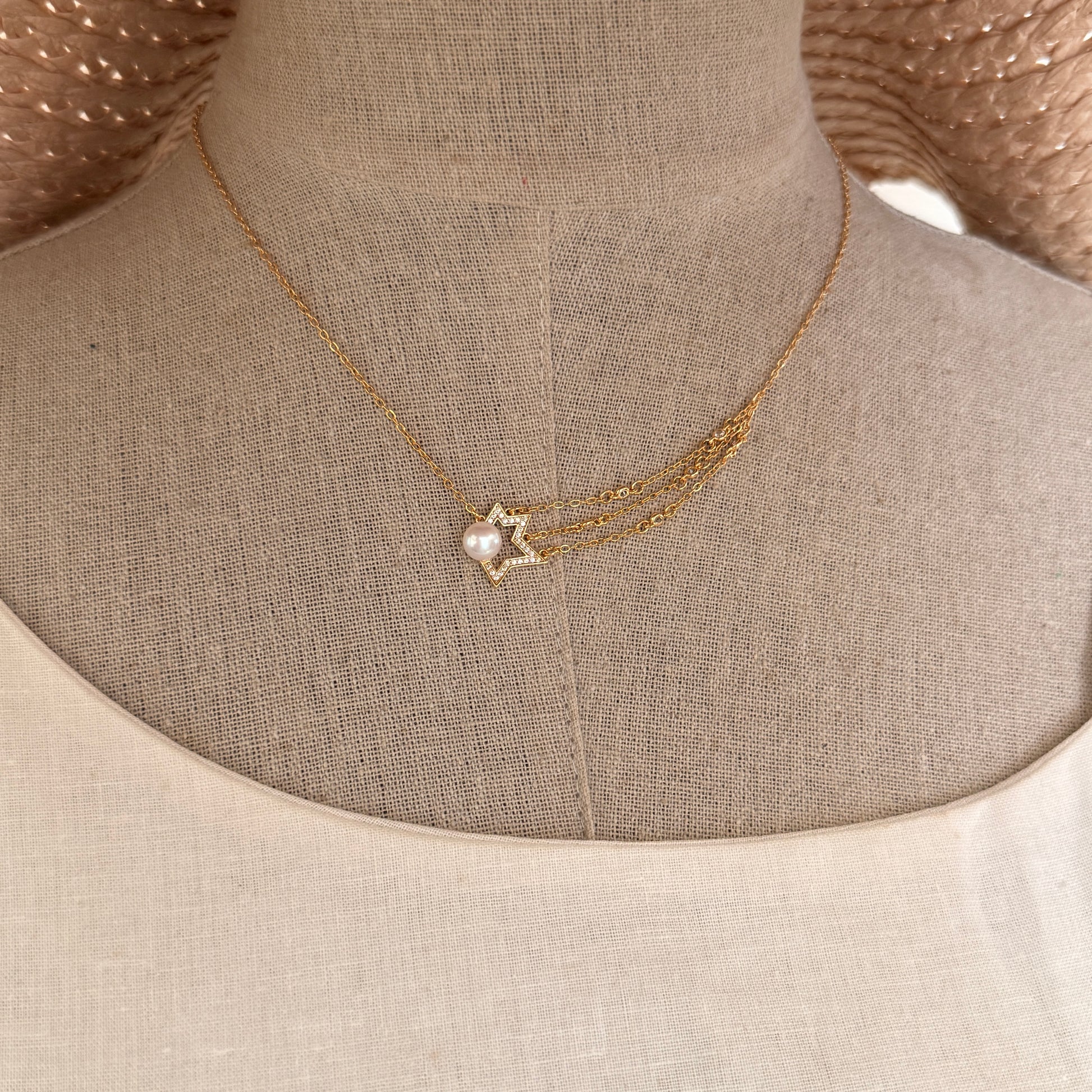 A radiant star charm rests beside a luminous pearl, while three delicate chains cascade like trails of starlight. Each detail is designed to echo the poetry of the night sky — romantic, ethereal, and timeless.